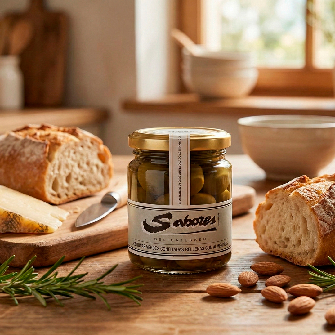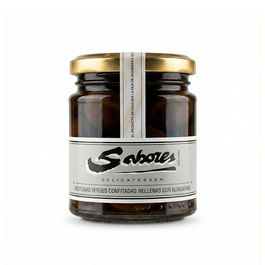Nuestra creación más original. Estas aceitunas ya sin sal, son confitadas con el método tradicional, logrando un producto único y delicioso. Se rellenan con almendra para emular su carozo. Recomendamos maridar con queso y una copa de espumante.