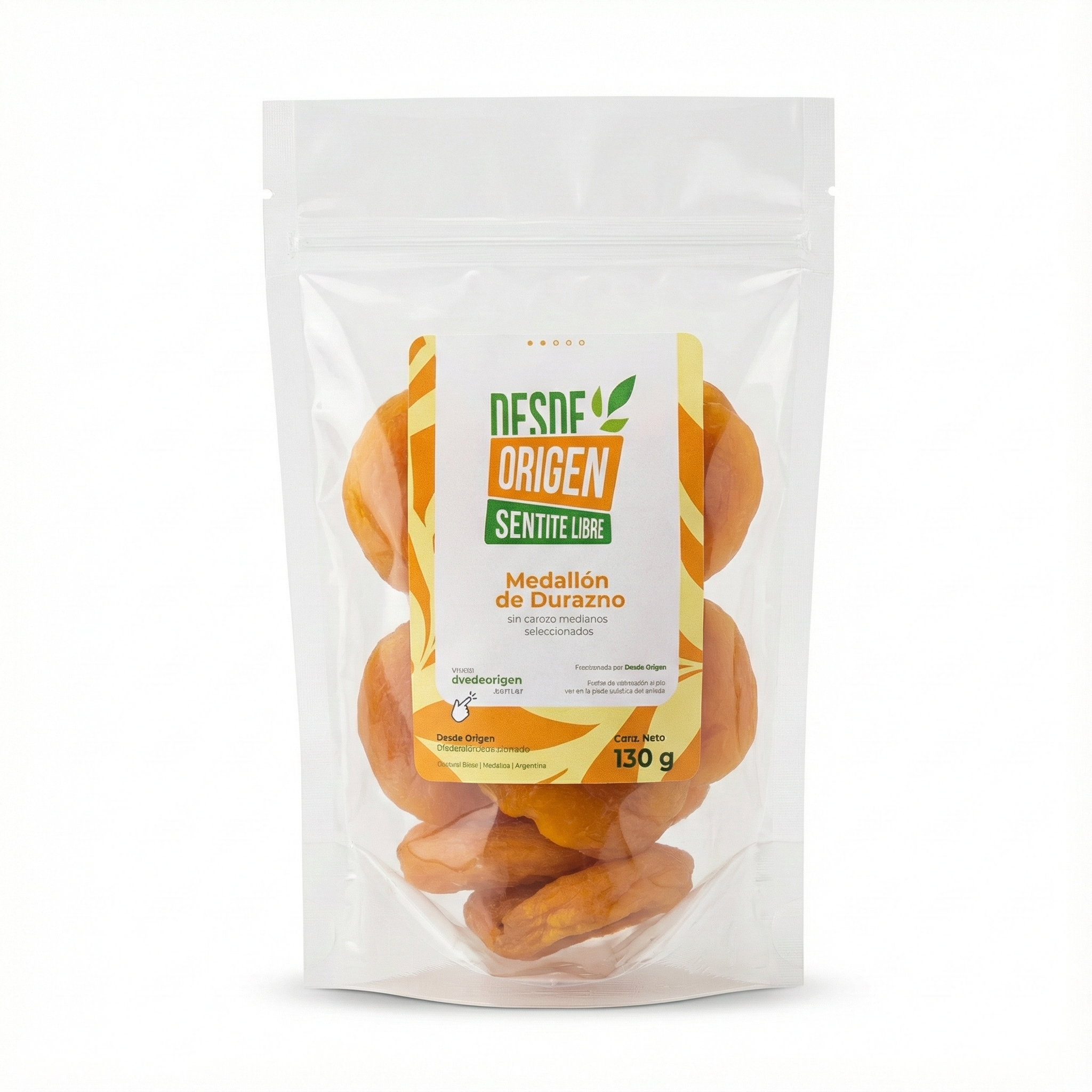 El durazno llevado a su forma más noble: tiempo, calor justo y nada más. Al desecarse, concentra su dulzor natural y ese aroma inconfundible que remite directo a fruta madura de verano.